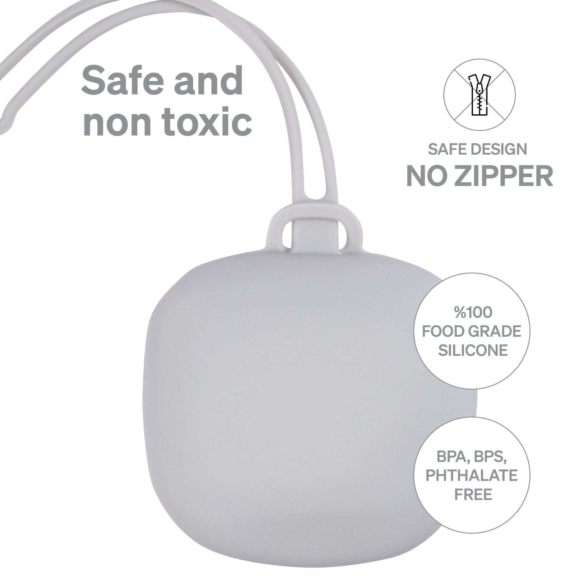 - Store and transport- Made from 100% Food Grade Silicone and free from any toxins such as BPA, BPS and phthalates. Our pacifier holder is soft but durable. It does not include any zippers or plastic parts, which makes it completely safe.