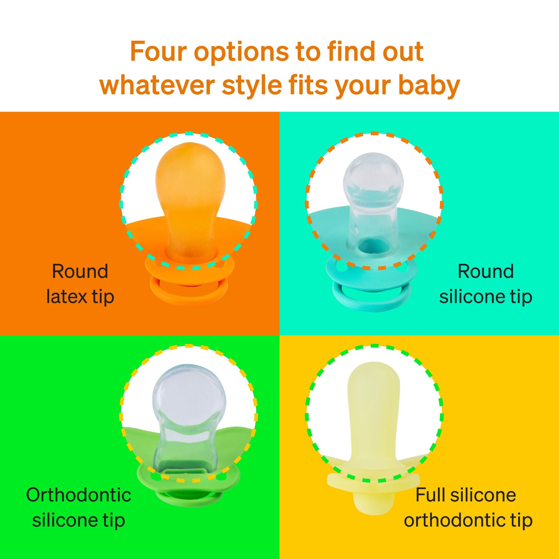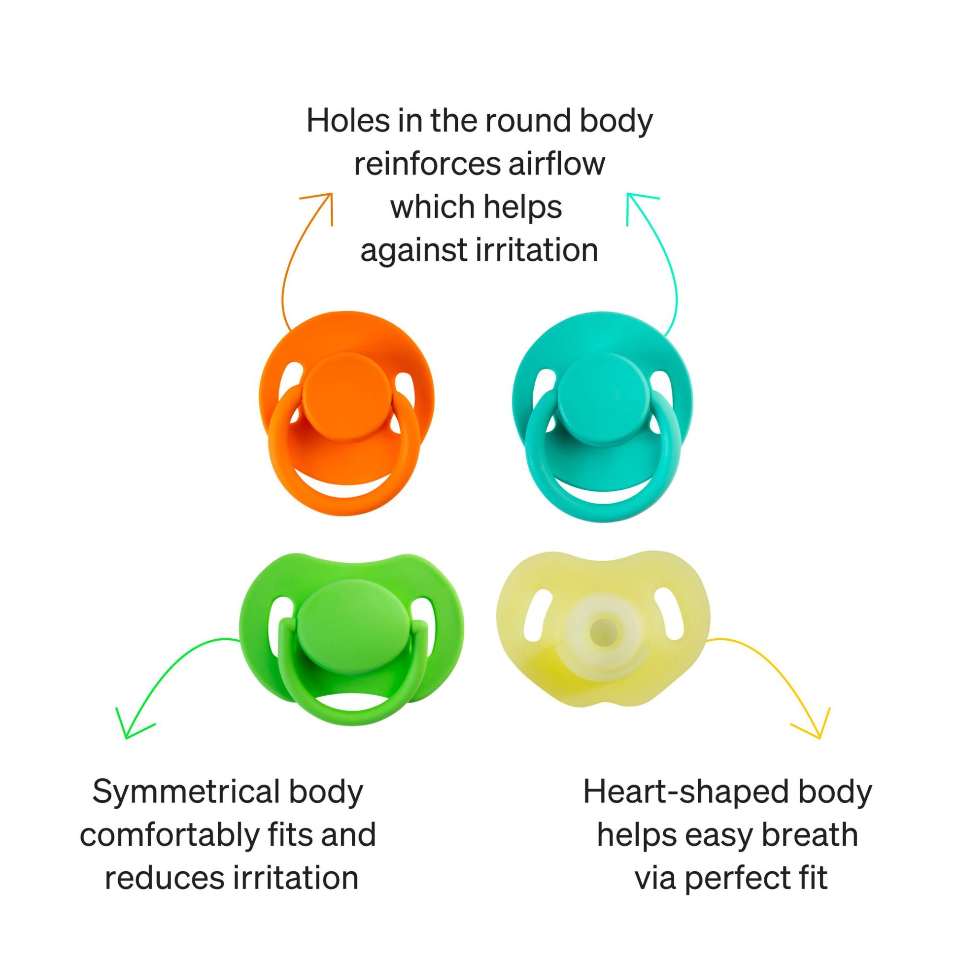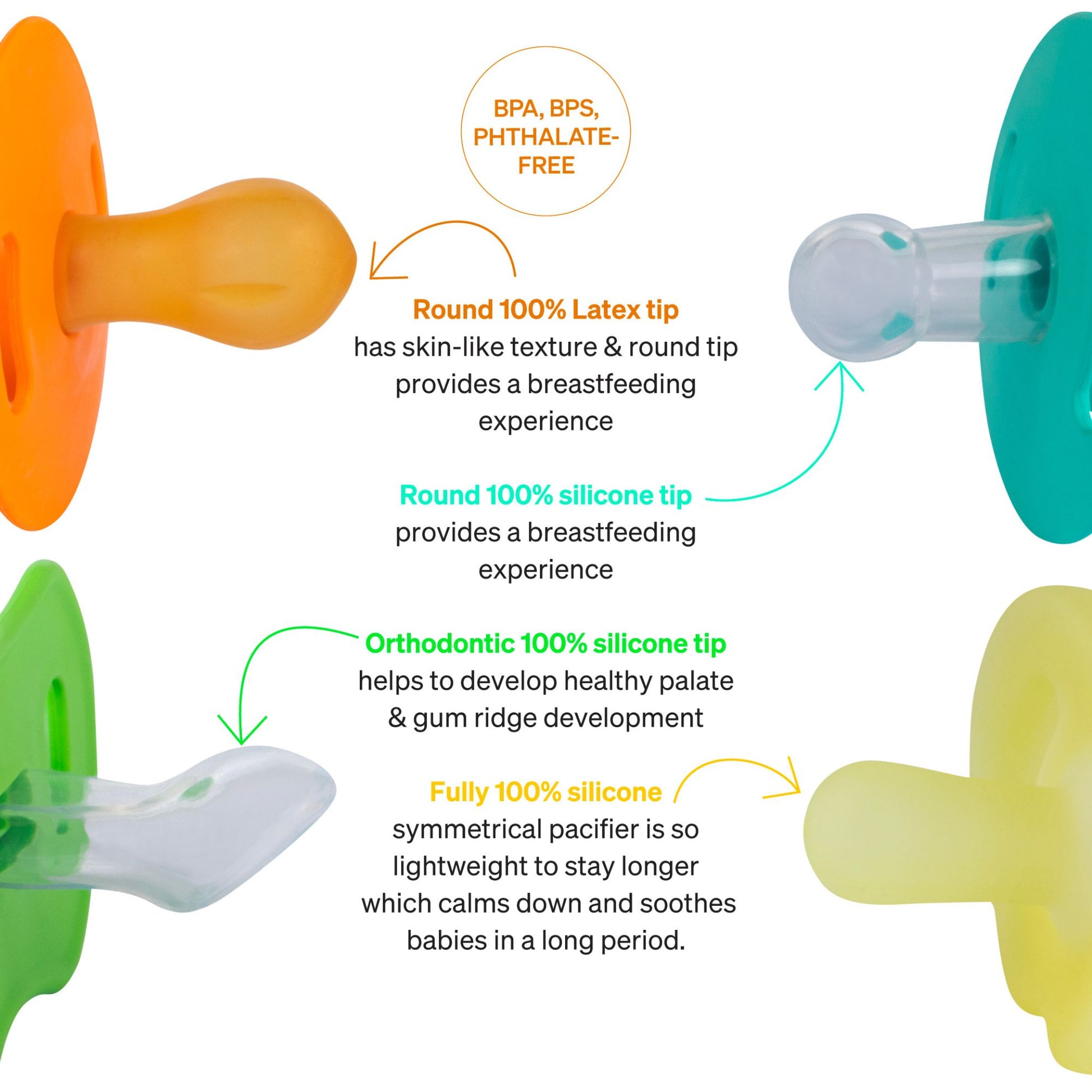 - The kit comes with 4 different options for 0-6 months babies. An orthodontic pacifier with a symmetrical body, a full silicone heart shaped soother, a natural rubber pacifier with a round body and a round pacifier with a round body.