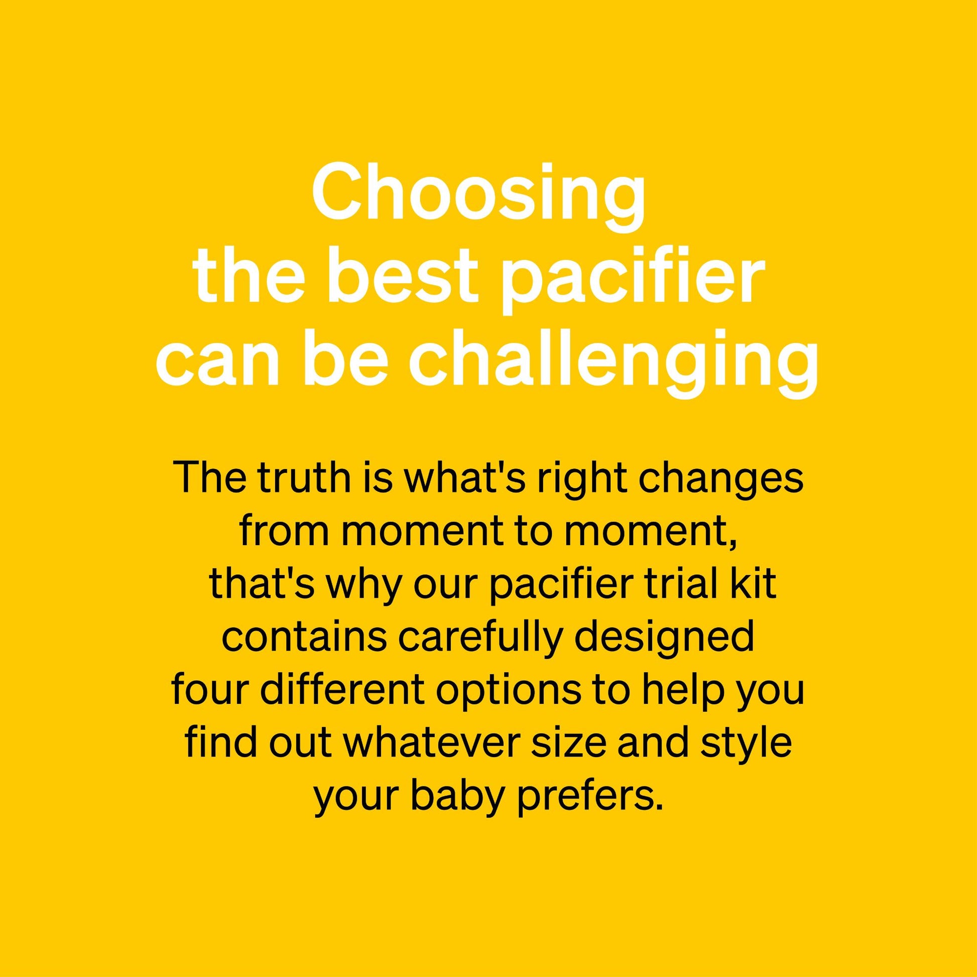 - We know that choosing the best baby pacifier can be challenging. Every baby is different and what’s right changes from moment to moment. After intensive research, we carefully designed a Pacifier Starter Kit to help parents find out whatever size and style their baby prefers.
