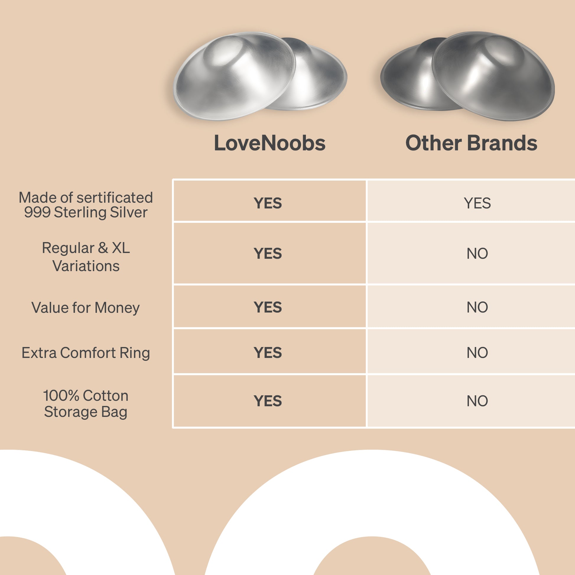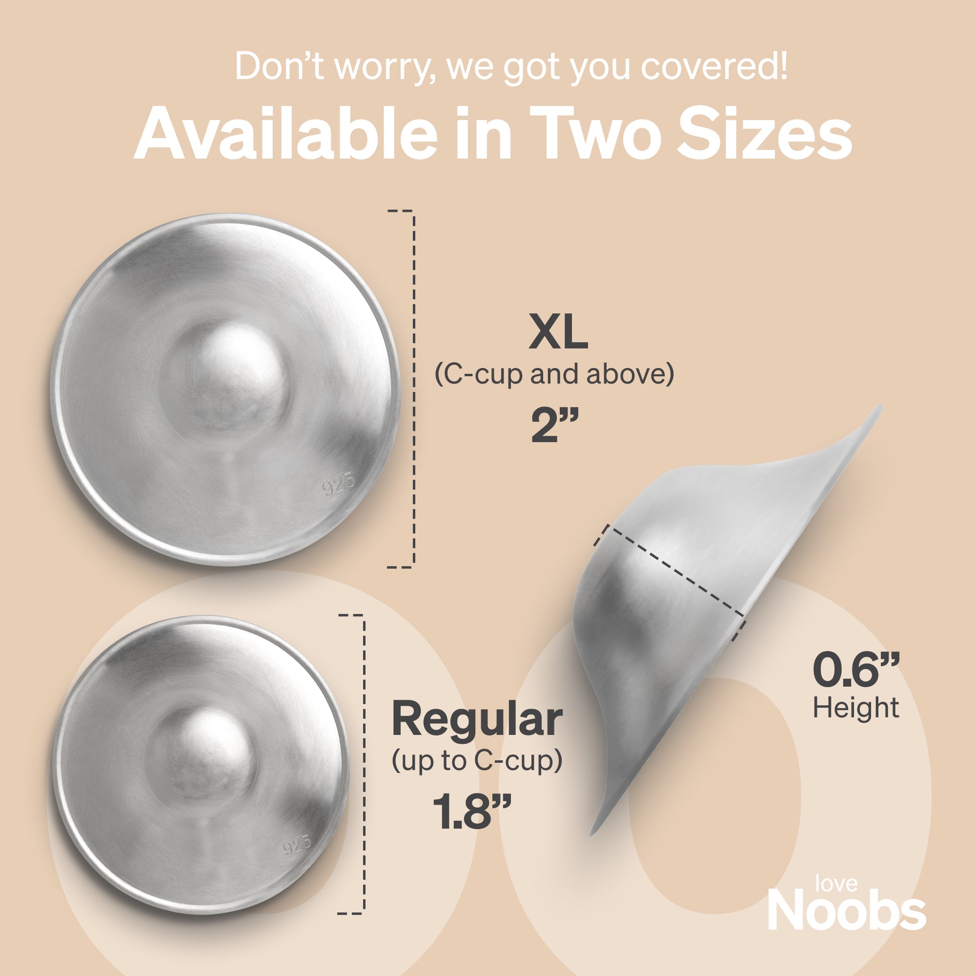 - ULTIMATE COMFORT FOR ANY BRA SIZE: Ergonomically designed and available in both regular and XL sizes, these nursing cups for breastfeeding are wearable under any bra size, just choose the right size for you to have all your silver nipple cups needs for breastfeeding comfort.
